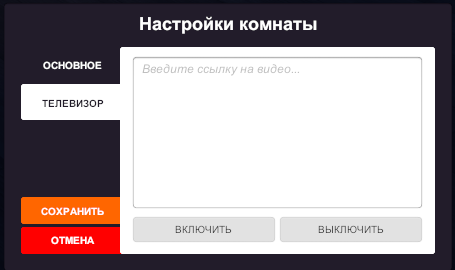 3. Далее Вам нужно открыть комнату для всех, друзей либо только для группы чтобы появилась кнопка настройки комнаты. В окне настроек комнаты Вы найдите пункт меню «Телевизор» и вставьте в текстовое поле прямую ссылку на видео-файл либо ссылку с облачного сервиса. Затем нажмине на кнопку «Включить». Слева снизу активируется интерфейс управления плеером.